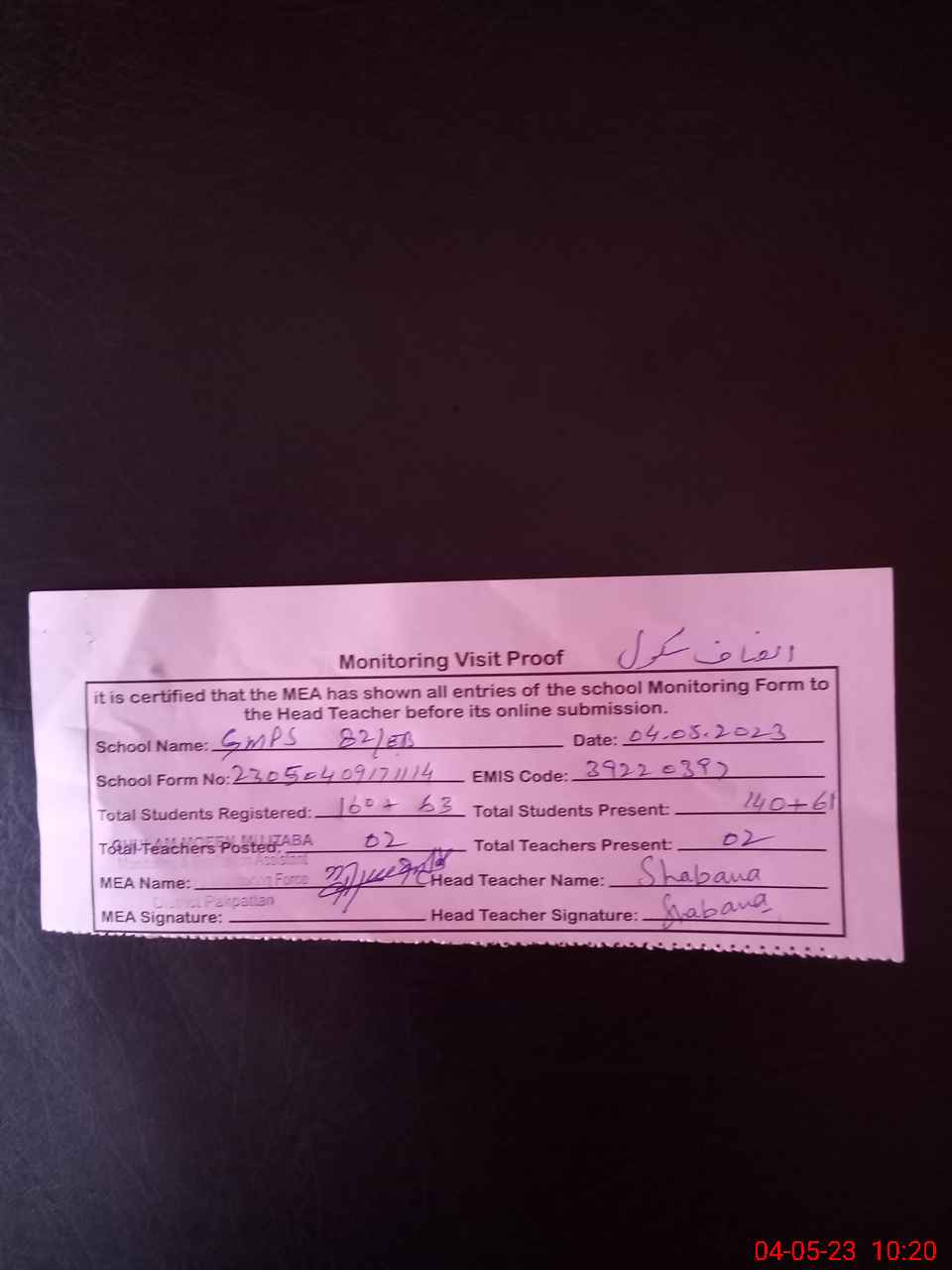 | Attendance Register | Head Teacher | MEA with School | Visit Proof |