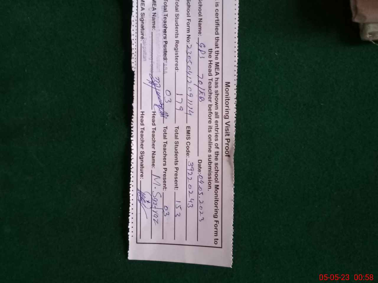 | Certified that this School was Inspected by the Undersigned MEA/DMO Today and the Information Stated Above is as Per Record. | |||||