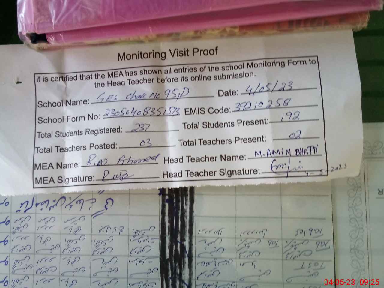 | Attendance Register | Head Teacher | MEA with School | Visit Proof |