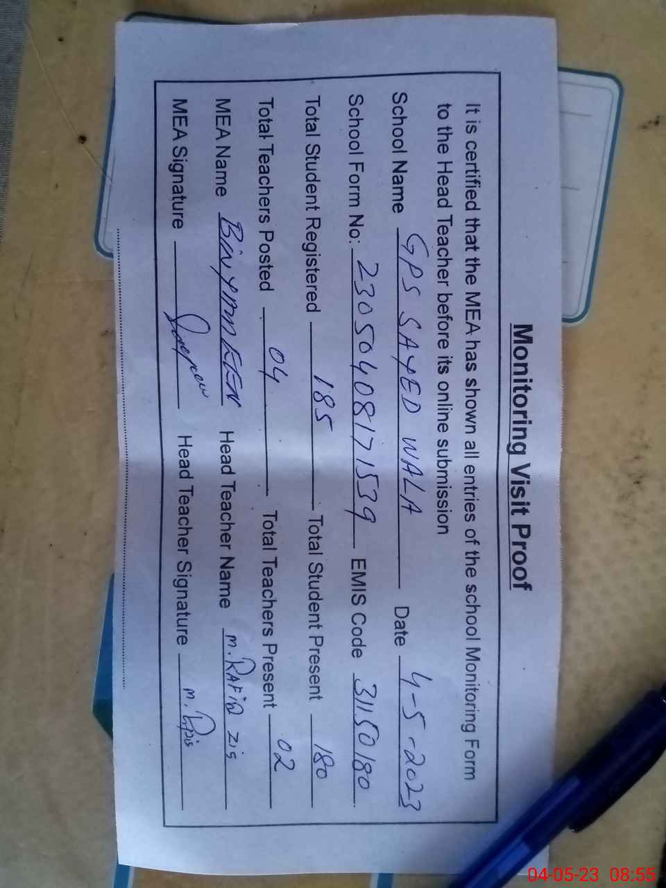 | EMIS Code: 31150180 | Name of School: GPS SAYED WALA | |||