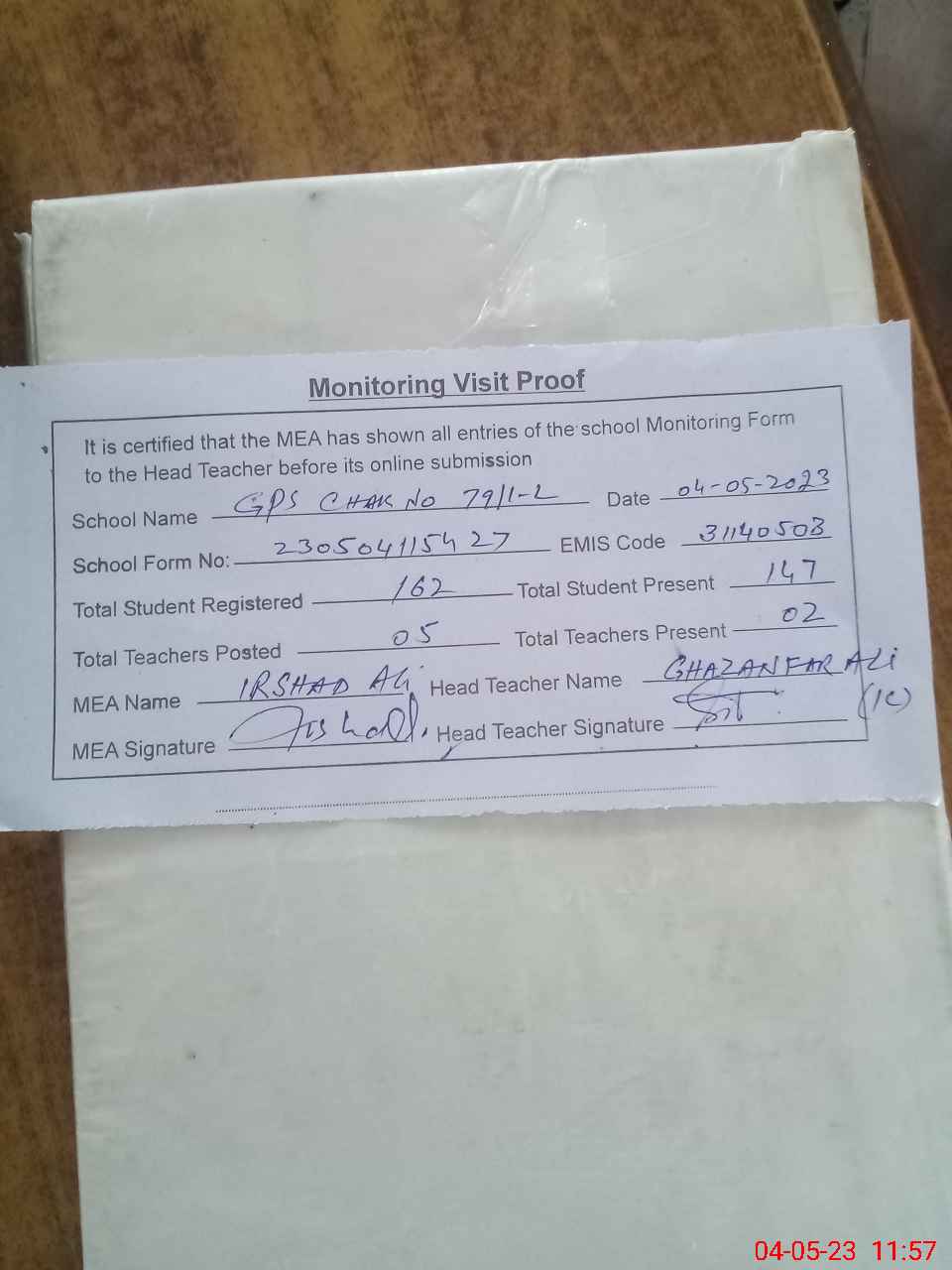 | Attendance Register | Head Teacher | MEA with School | Visit Proof |