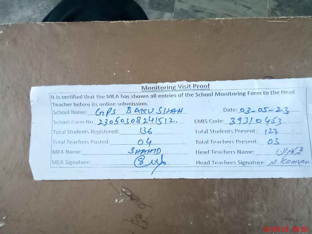| Attendance Register | Head Teacher | MEA with School | Visit Proof |