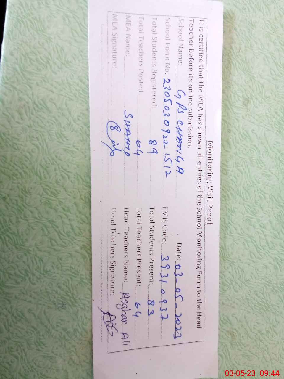 | Certified that this School was Inspected by the Undersigned MEA/DMO Today and the Information Stated Above is as Per Record. | |||||