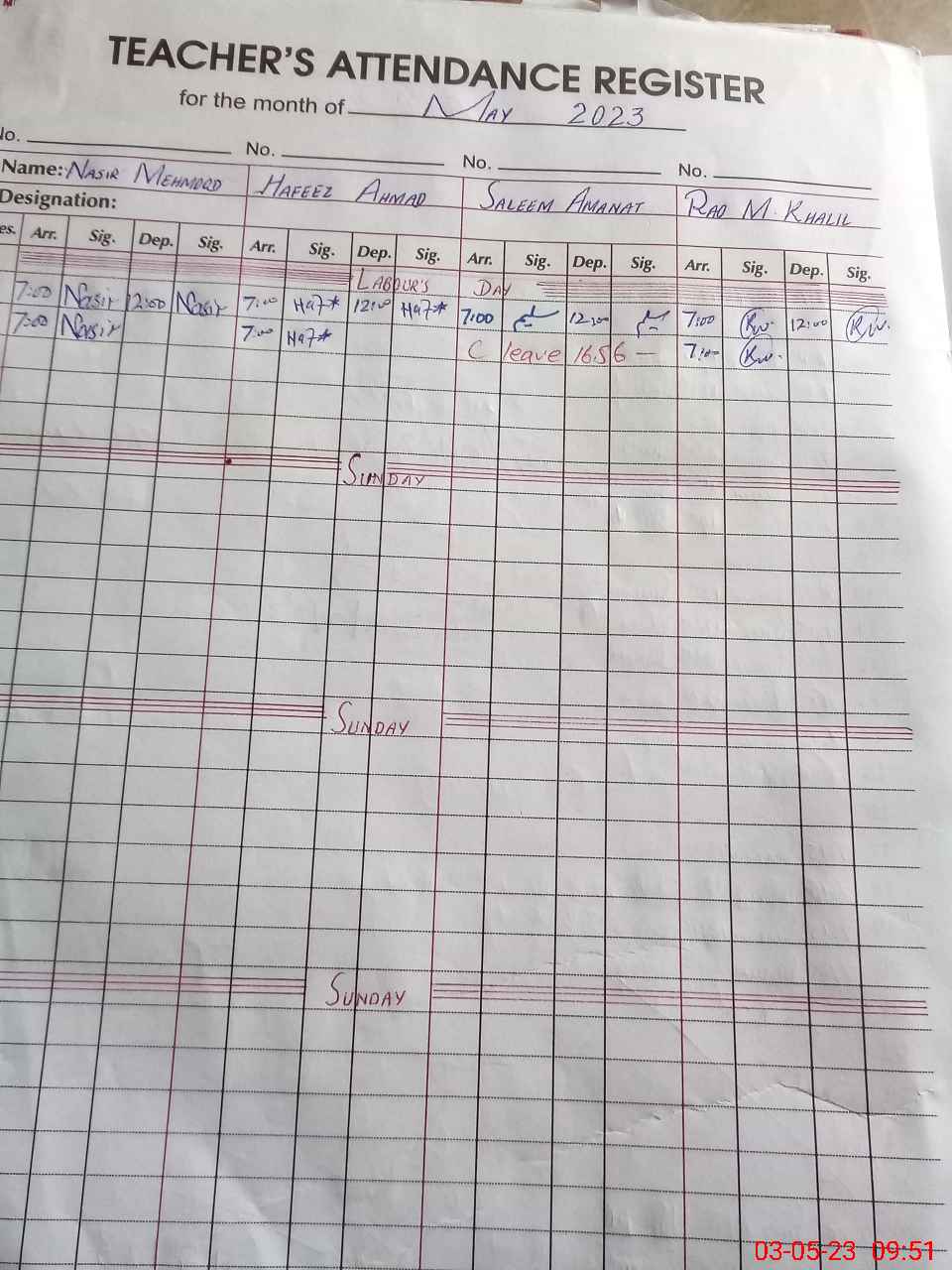 | CNIC | Full Name | Designation | R/C | Absence During Last Calender Month |