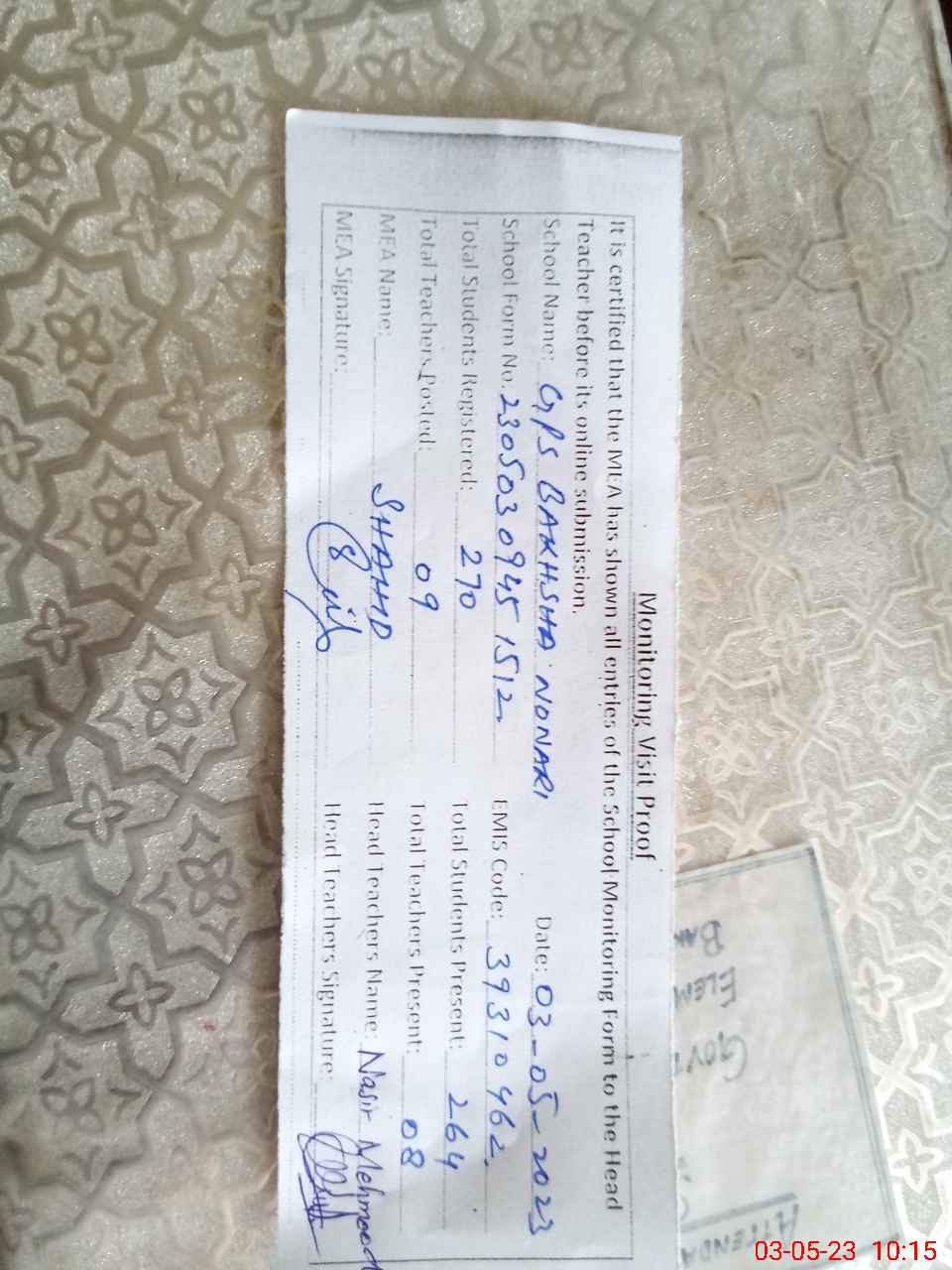 | Certified that this School was Inspected by the Undersigned MEA/DMO Today and the Information Stated Above is as Per Record. | |||||