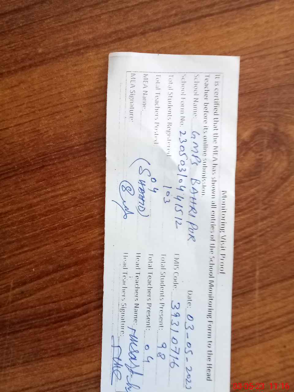| Attendance Register | Head Teacher | MEA with School | Visit Proof |