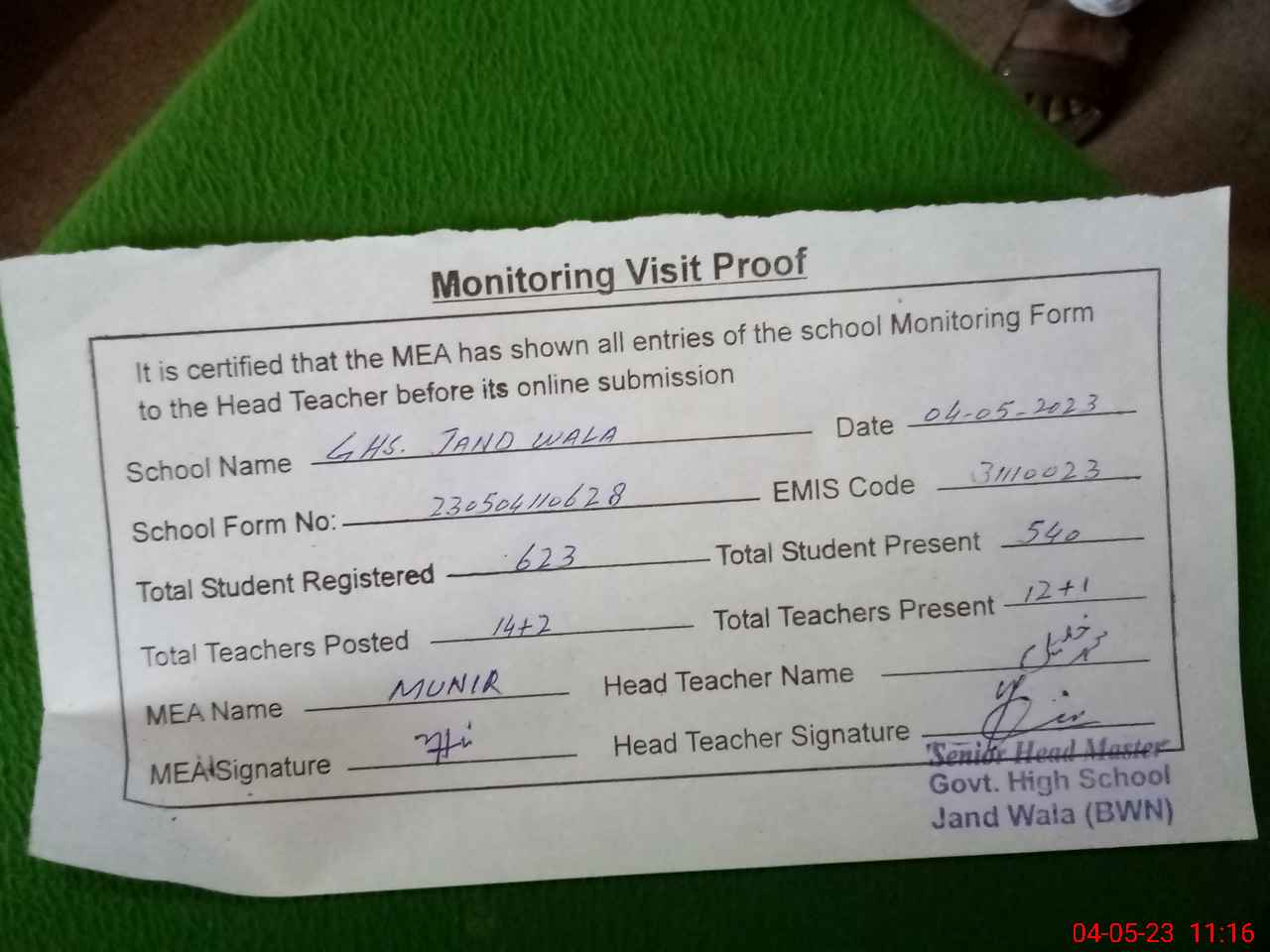 | Attendance Register | Head Teacher | MEA with School | Visit Proof |