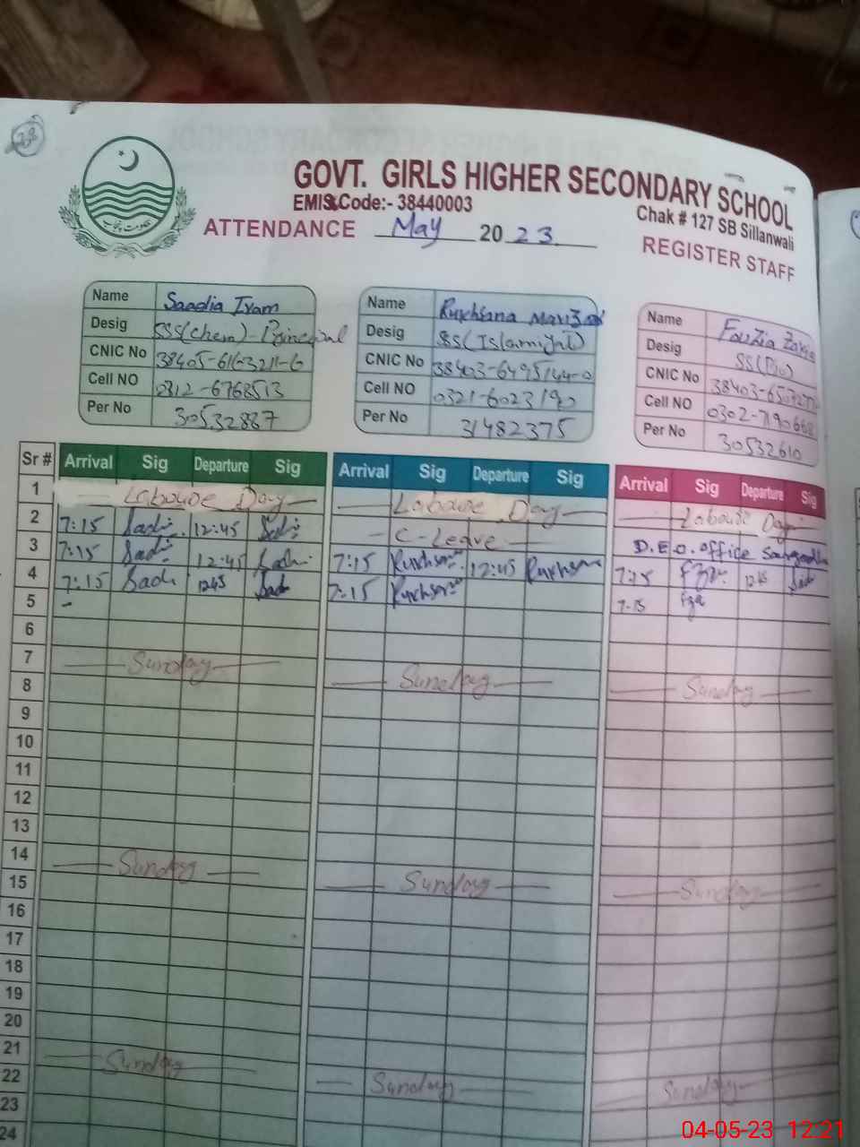 | Name: SA**** IR**** Designation: (School Headmaster's/Headmistress's) I/C PRINCIPAL Phone/Cell Number: 03**** |