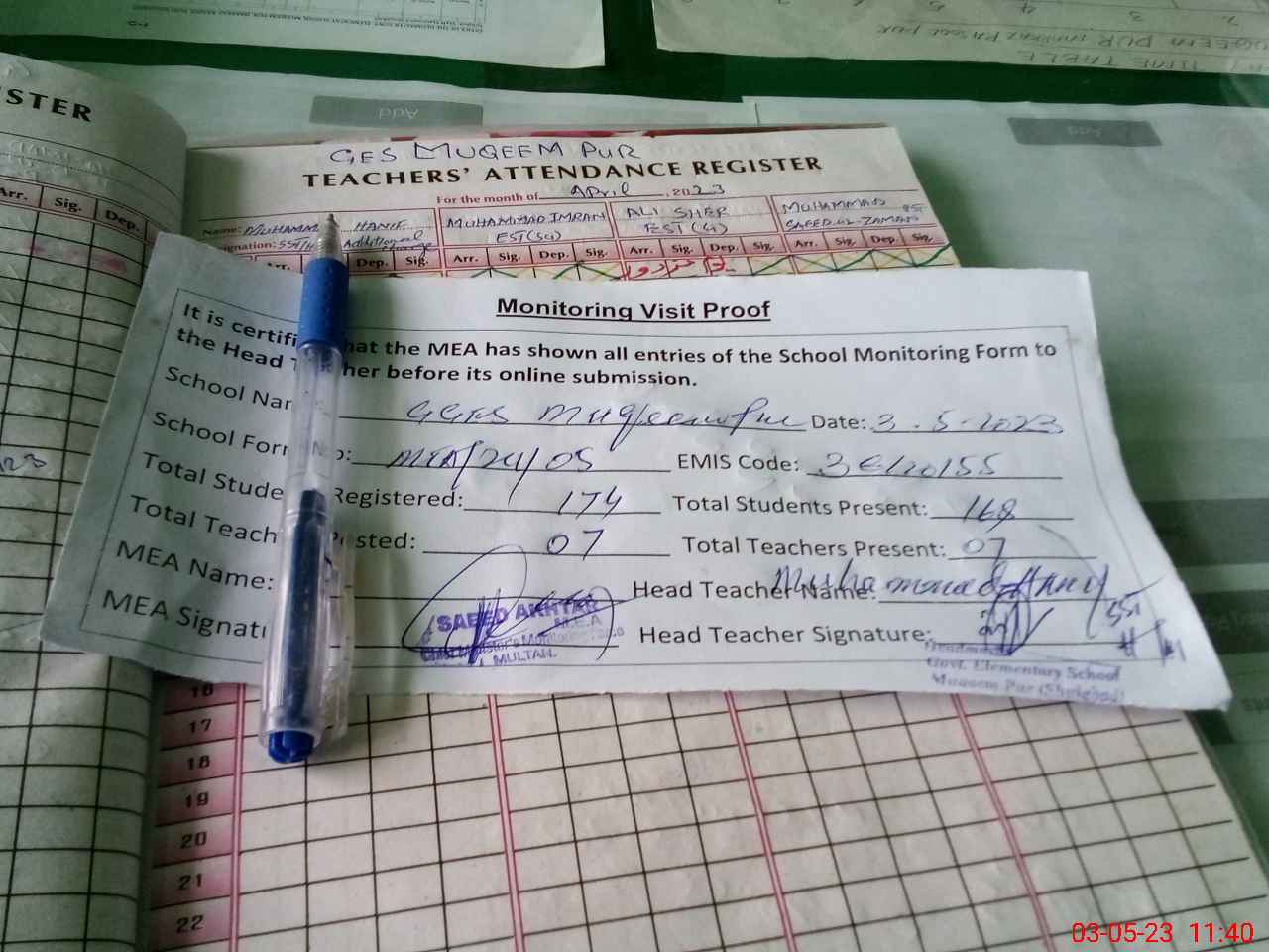 | Attendance Register | Head Teacher | MEA with School | Visit Proof |