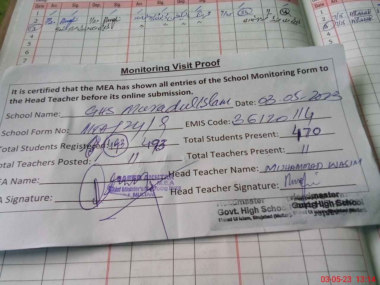 | Attendance Register | Head Teacher | MEA with School | Visit Proof |