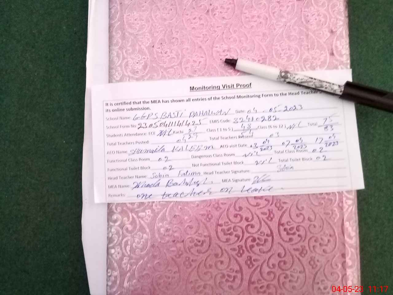 | Remarks (Use Separate Page if Required): One teacher on leave over all clean good | |||||