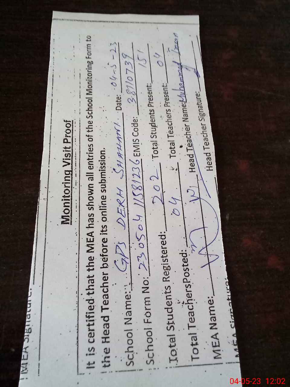 | Attendance Register | Head Teacher | MEA with School | Visit Proof |