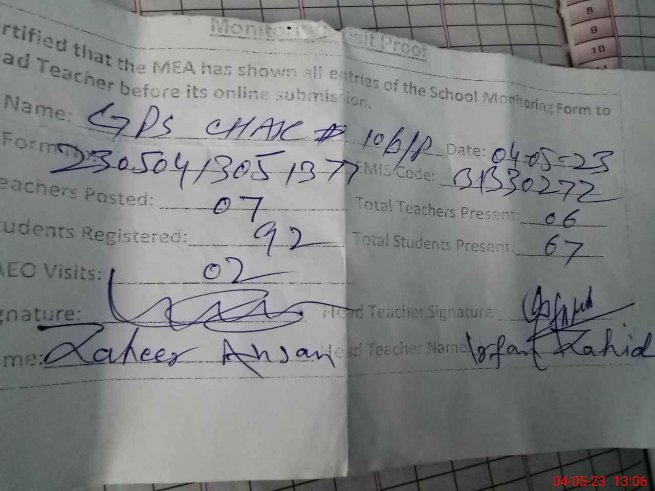| Attendance Register | Head Teacher | MEA with School | Visit Proof |