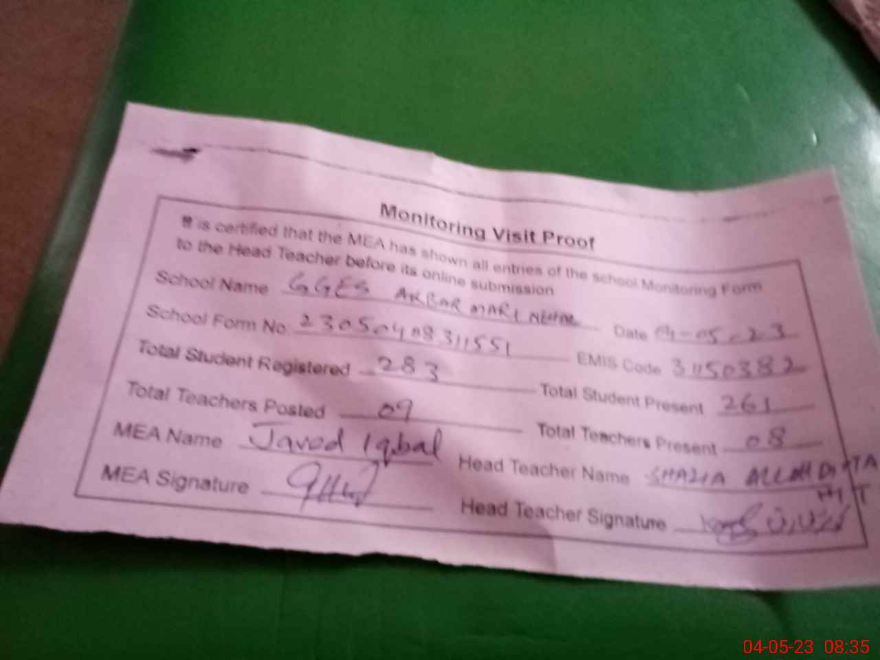 | Attendance Register | Head Teacher | MEA with School | Visit Proof |
