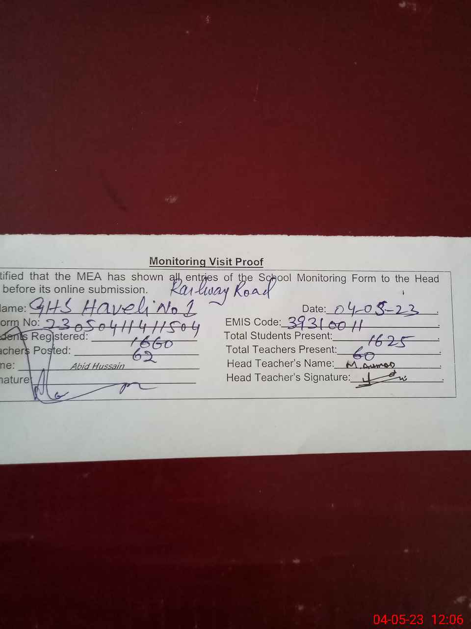 | Name: MU**** Ra**** Designation: (School Headmaster's/Headmistress's) Principal Phone/Cell Number: 03**** |