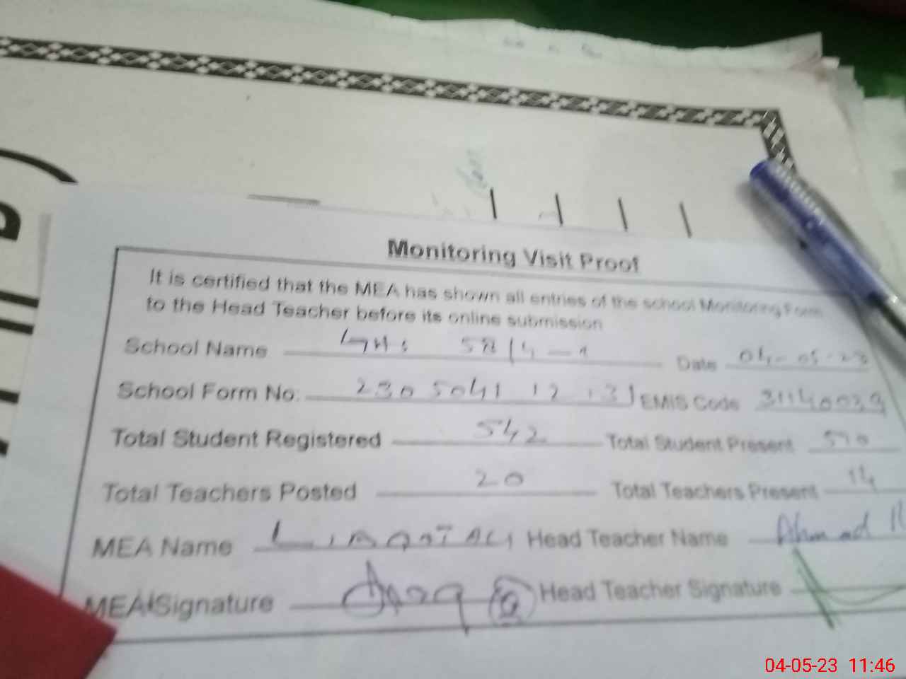 | Attendance Register | Head Teacher | MEA with School | Visit Proof |