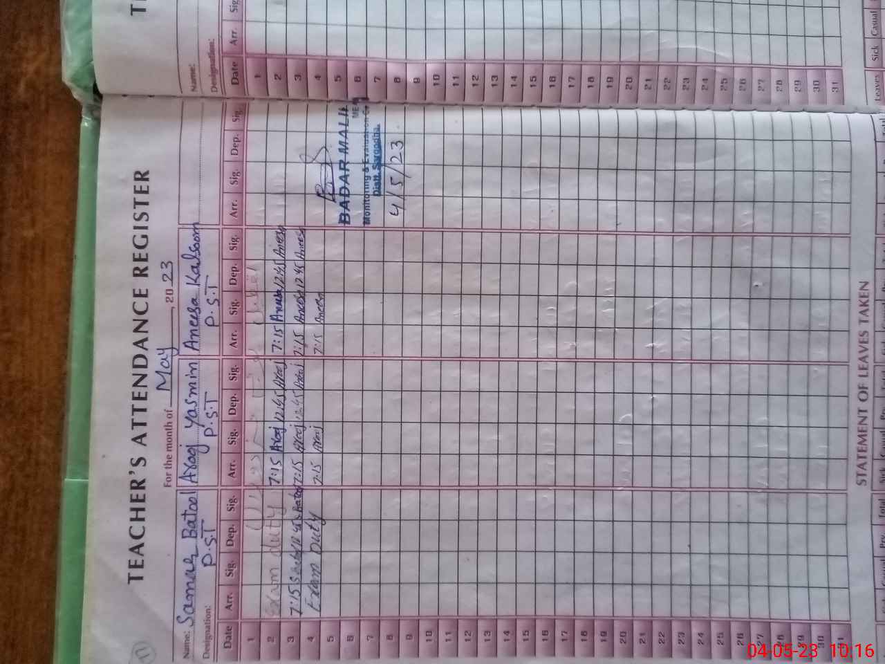 | 38**** | Sa**** Ba**** | PST | Regular | 0 | 0 | 0 | 0 | 0 | 0 | 0 | 0 | 0 | Exam Duty |