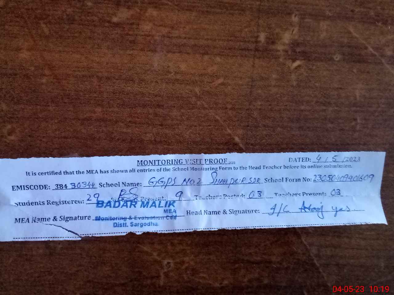 | Attendance Register | Head Teacher | MEA with School | Visit Proof |