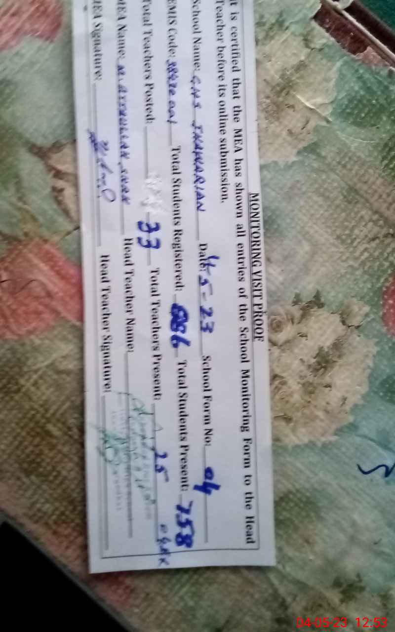 | Attendance Register | Head Teacher | MEA with School | Visit Proof |