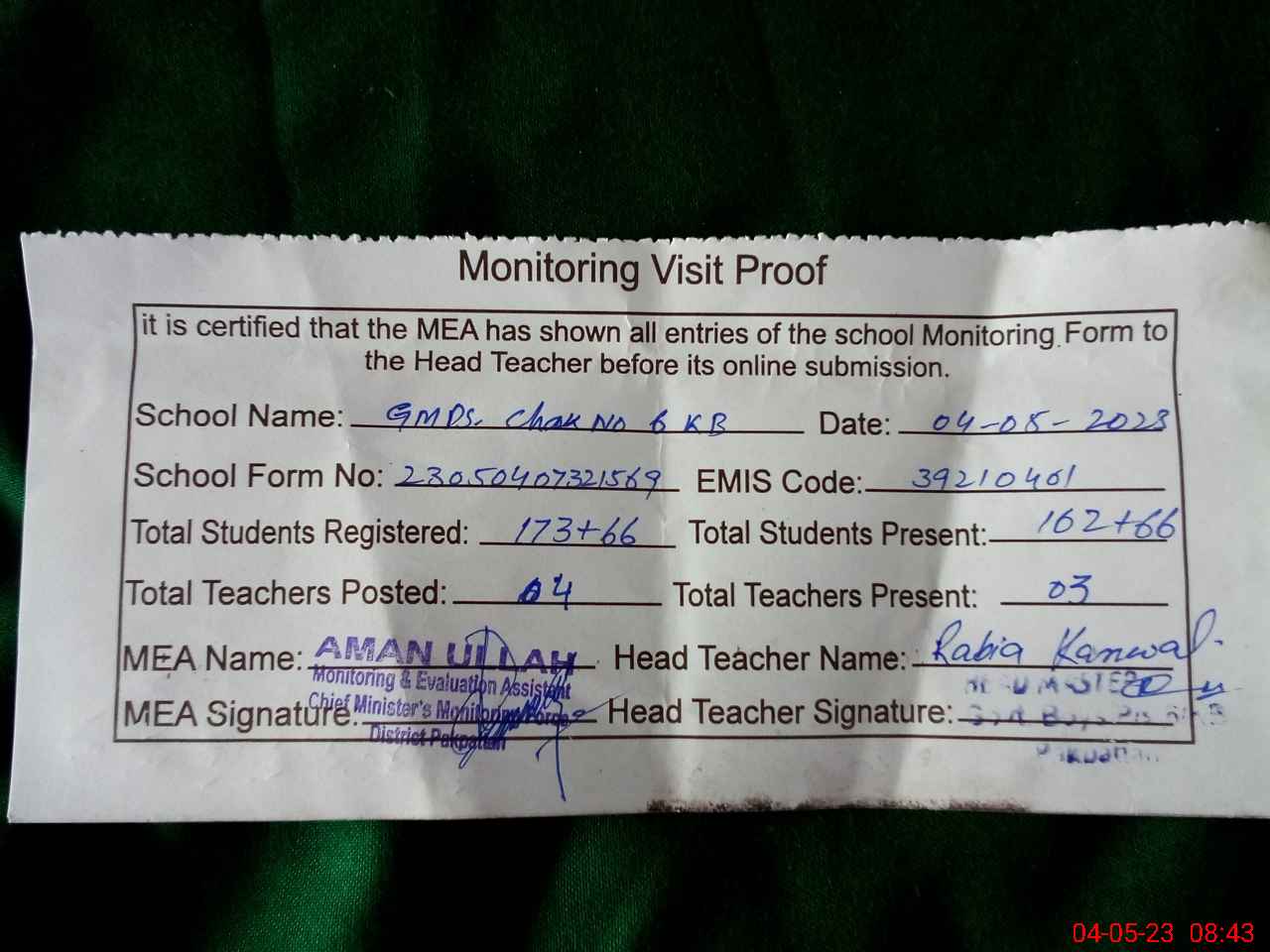 | EMIS Code: 39210401 | Name of School: GMPS CHAK NO 6-KB | |||