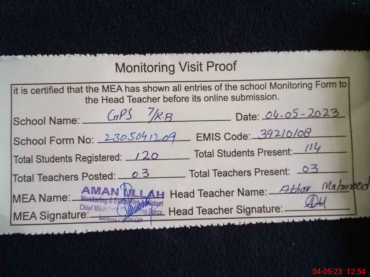| Attendance Register | Head Teacher | MEA with School | Visit Proof |