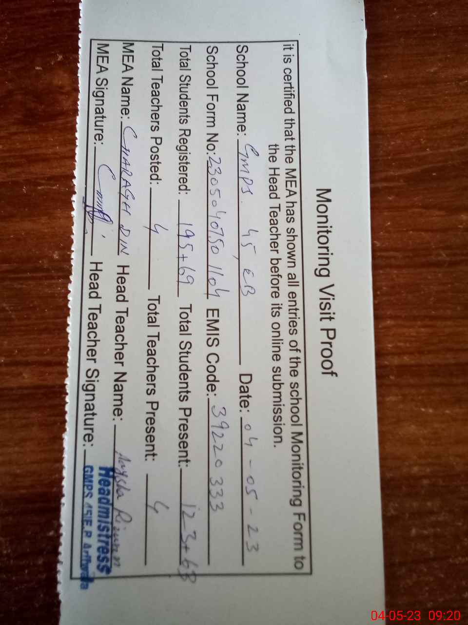| EMIS Code: 39220330 | Name of School: GMPS 45 EB | |||