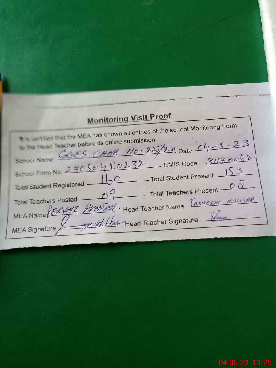 | Attendance Register | Head Teacher | MEA with School | Visit Proof |
