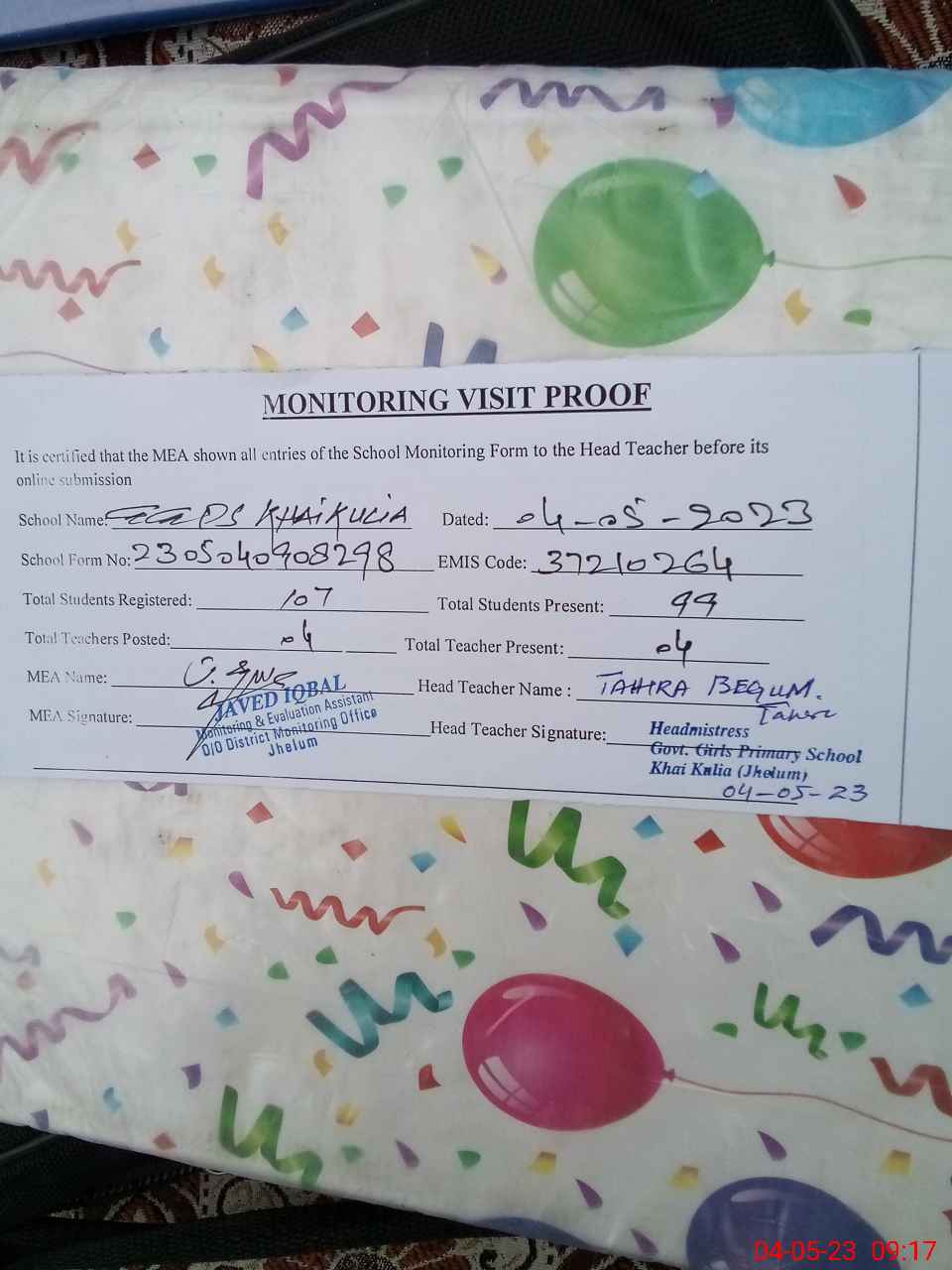 | Attendance Register | Head Teacher | MEA with School | Visit Proof |