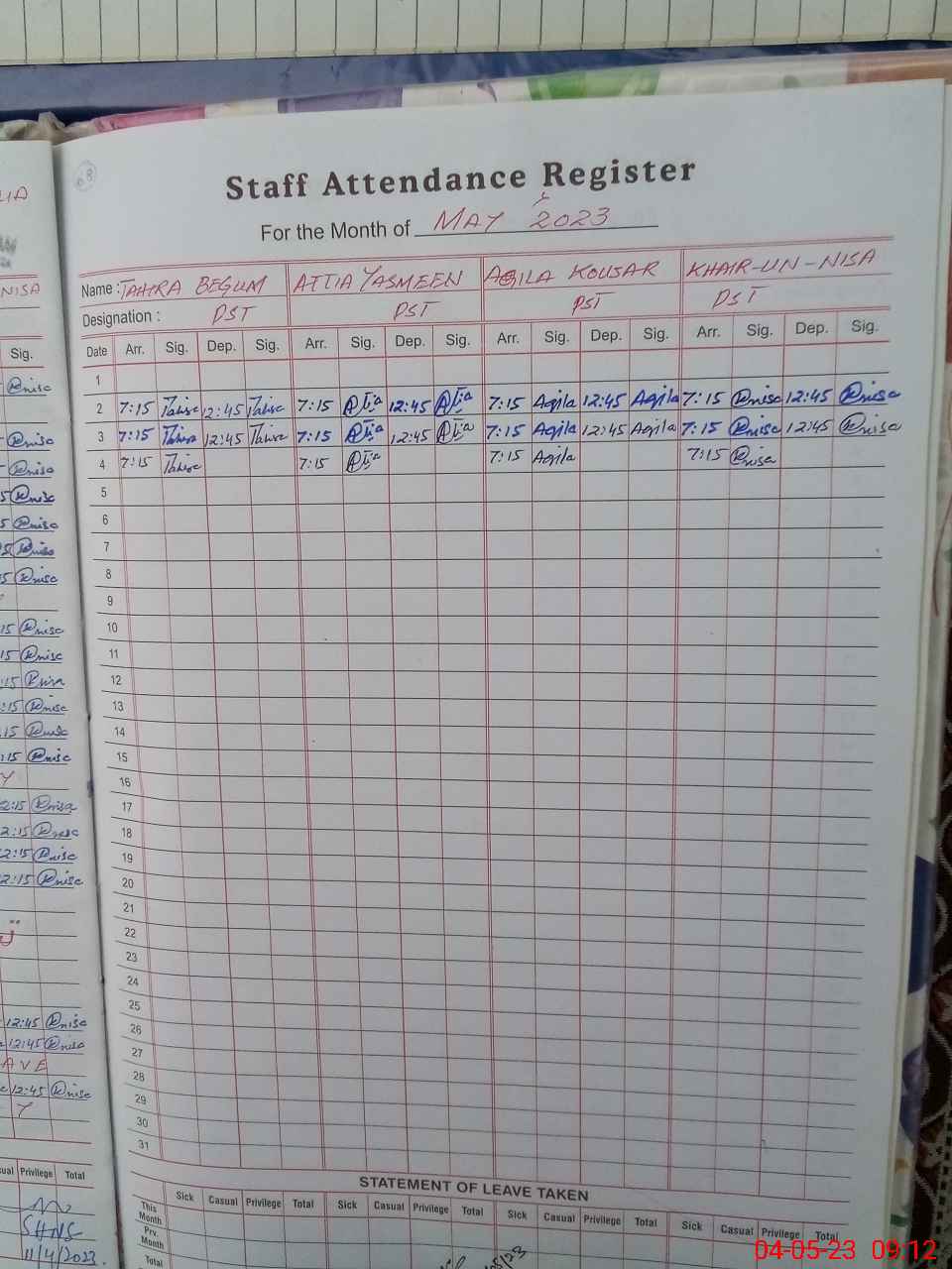 | Leave | Duty | Absent | Maternity | Medical | Ex- Pak |