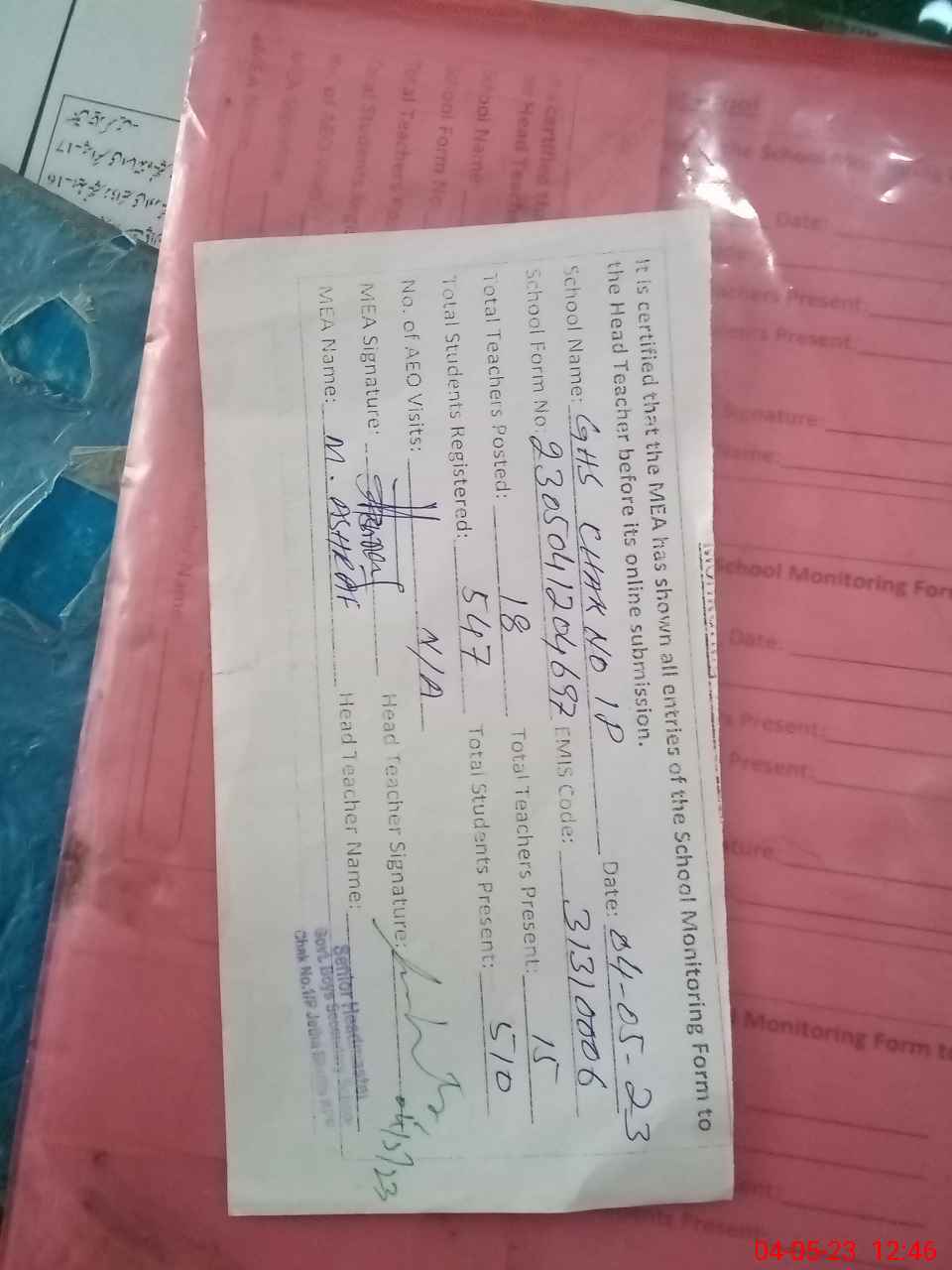 | Attendance Register | Head Teacher | MEA with School | Visit Proof |