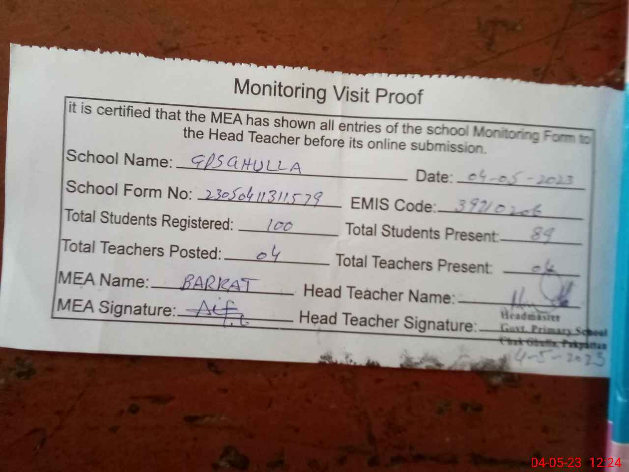 | Attendance Register | Head Teacher | MEA with School | Visit Proof |