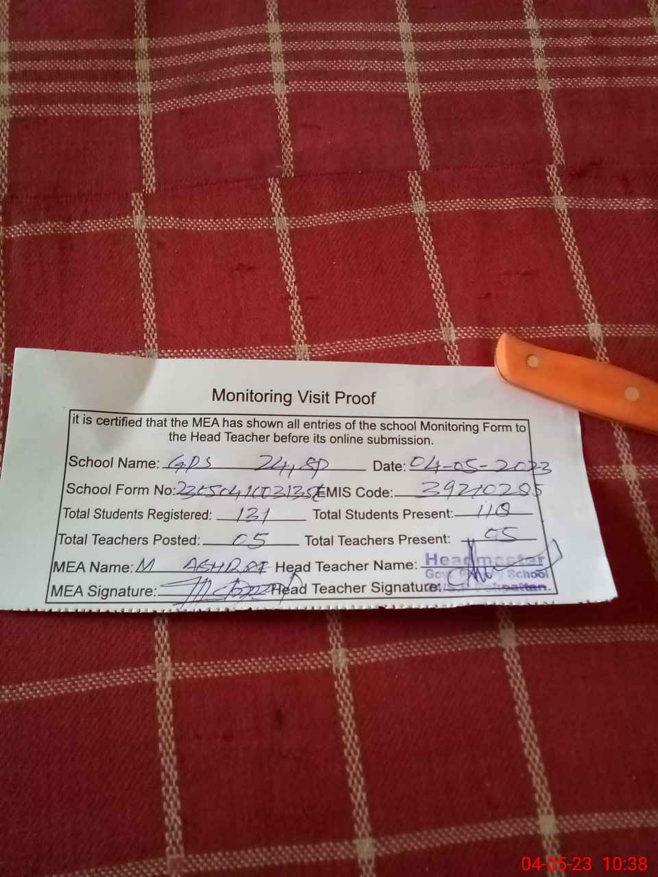 | Attendance Register | Head Teacher | MEA with School | Visit Proof |