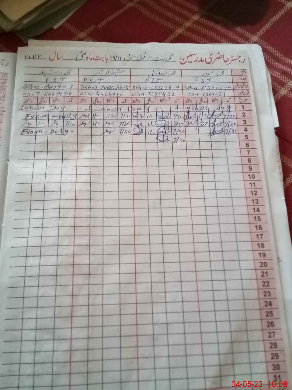 | 36**** | Mu**** Ra**** | PST | Regular | 0 | 0 | 0 | 0 | 0 | 0 | 0 | 0 | 0 | Exam Duty |