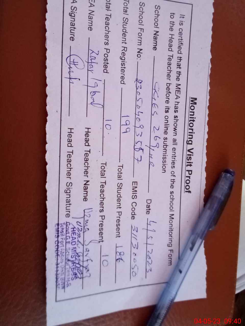 | Attendance Register | Head Teacher | MEA with School | Visit Proof |