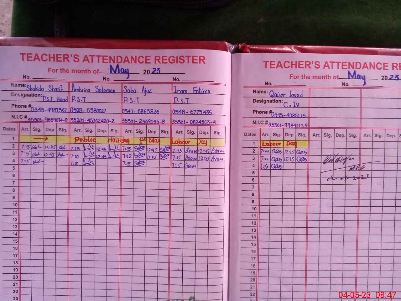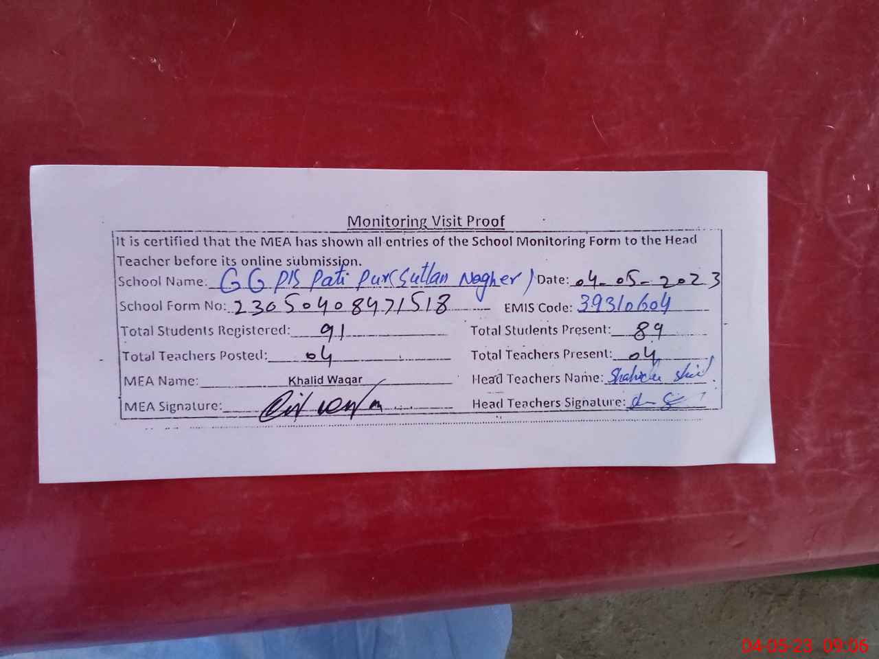 | Attendance Register | Head Teacher | MEA with School | Visit Proof |