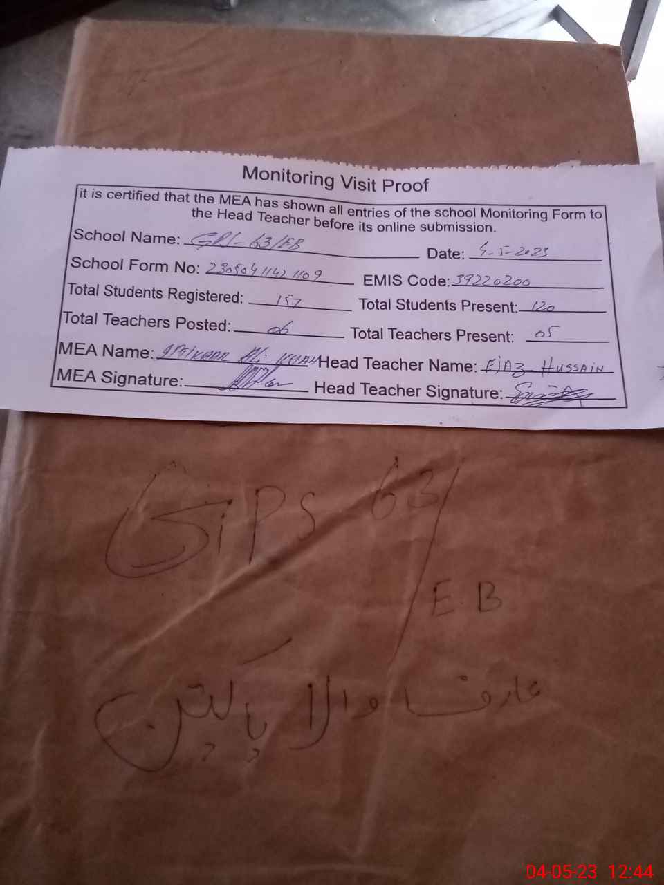 | Attendance Register | Head Teacher | MEA with School | Visit Proof |