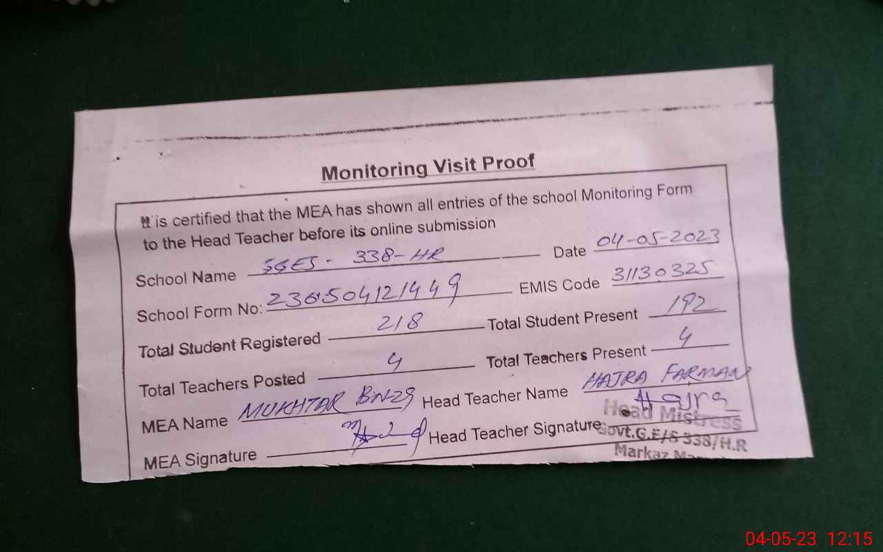 | EMIS Code: 31130325 | Name of School: GGES CHAK NO 338 HR | |||