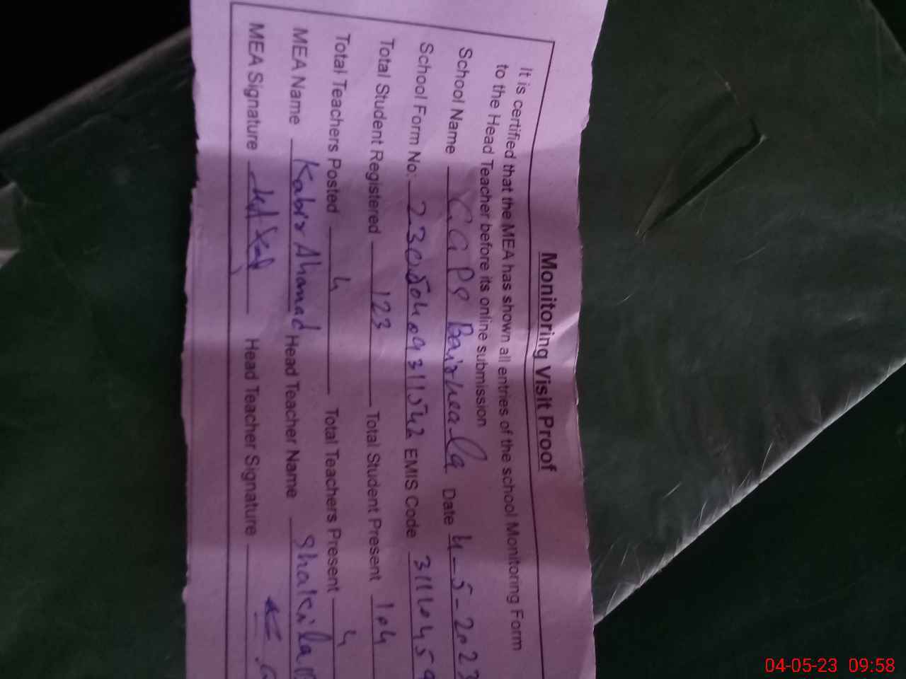 | Attendance Register | Head Teacher | MEA with School | Visit Proof |