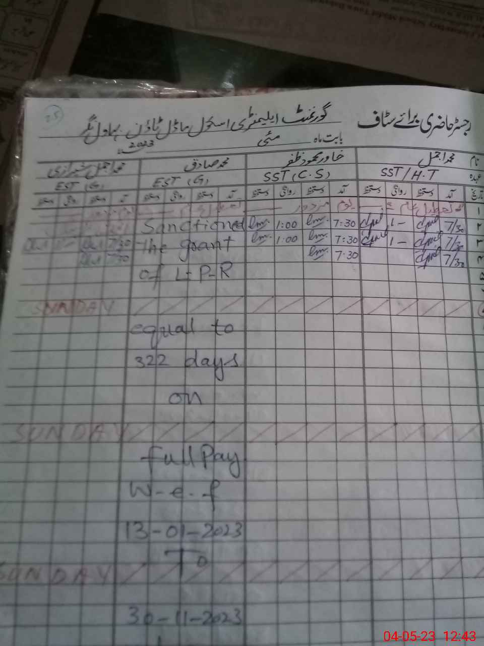 | 31**** | Na**** Sa**** Fa**** | PST | Regular | 0 | 0 | 0 | 0 | 0 | 0 | 0 | 0 | 0 | Exam Duty |