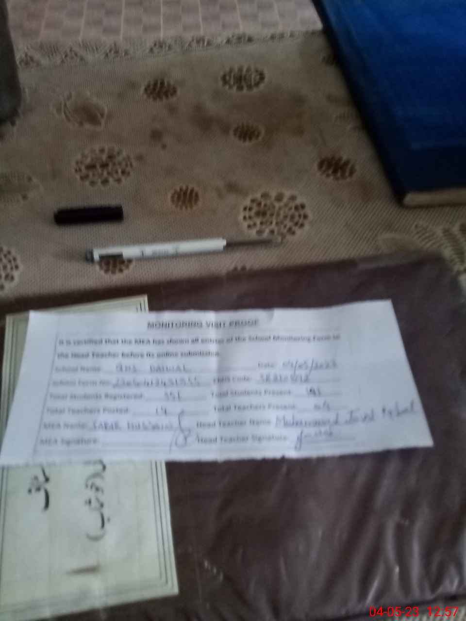 | Attendance Register | Head Teacher | MEA with School | Visit Proof |