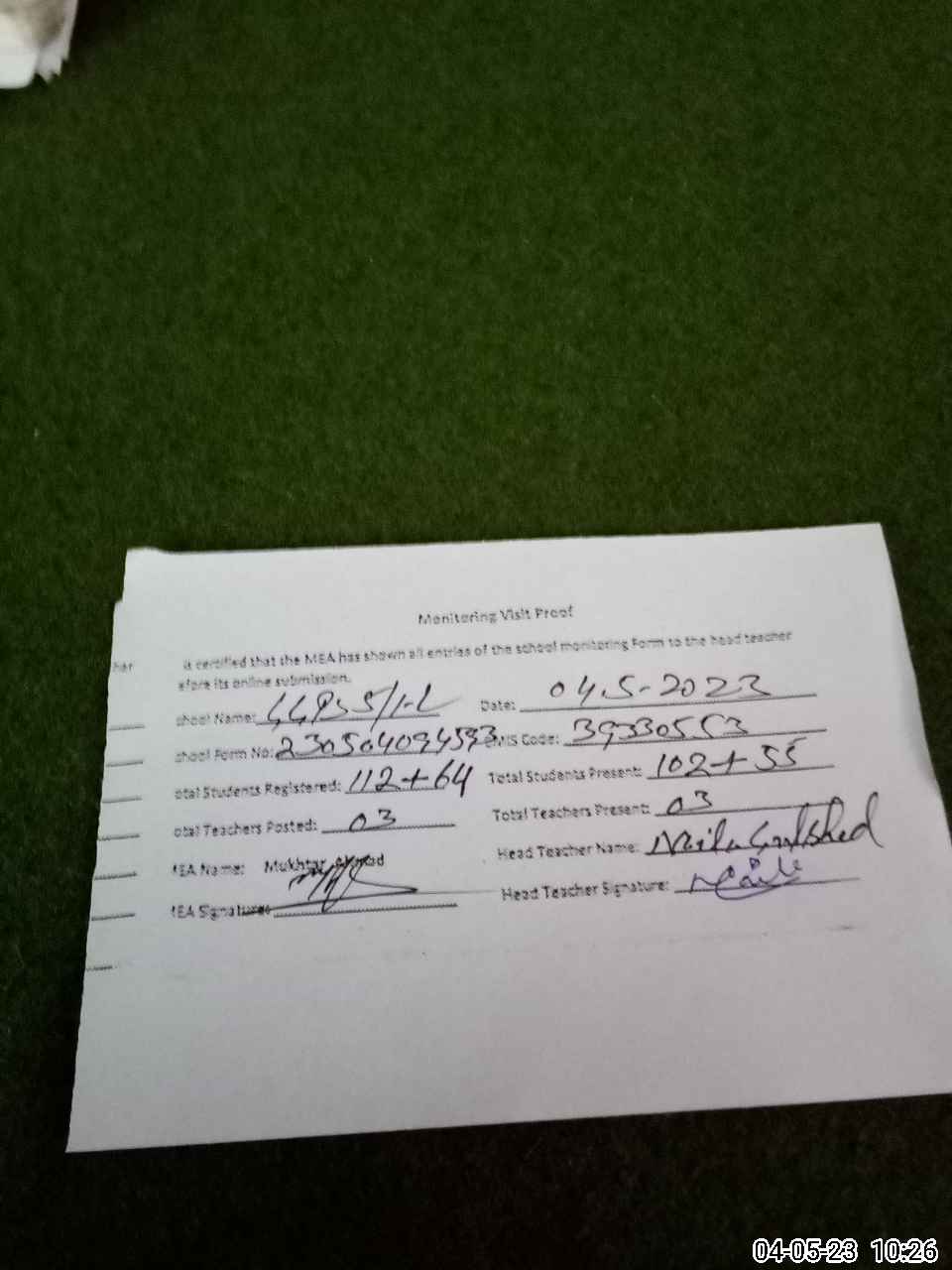 | Attendance Register | Head Teacher | MEA with School | Visit Proof |