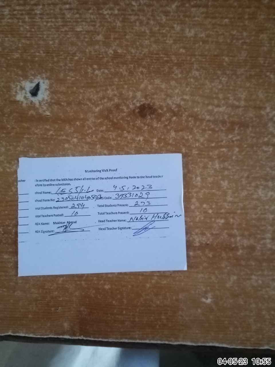 | Attendance Register | Head Teacher | MEA with School | Visit Proof |