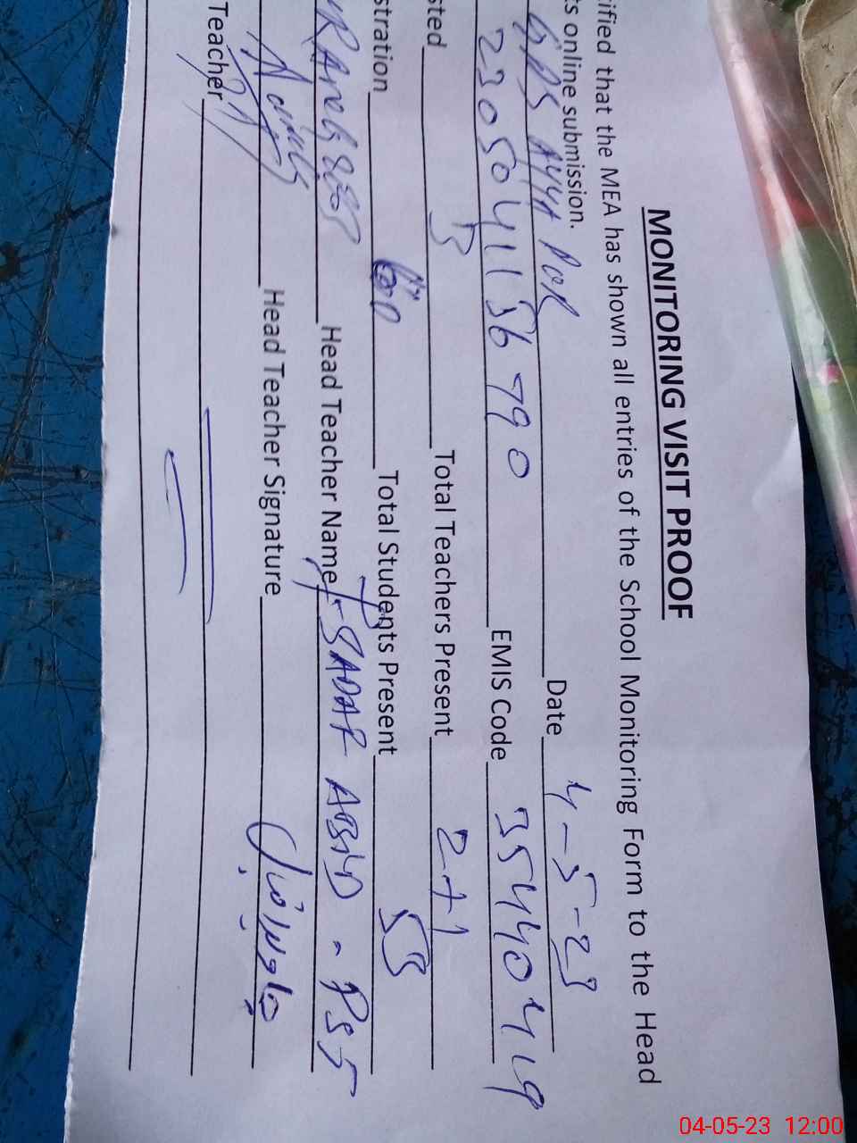 | Attendance Register | Head Teacher | MEA with School | Visit Proof |