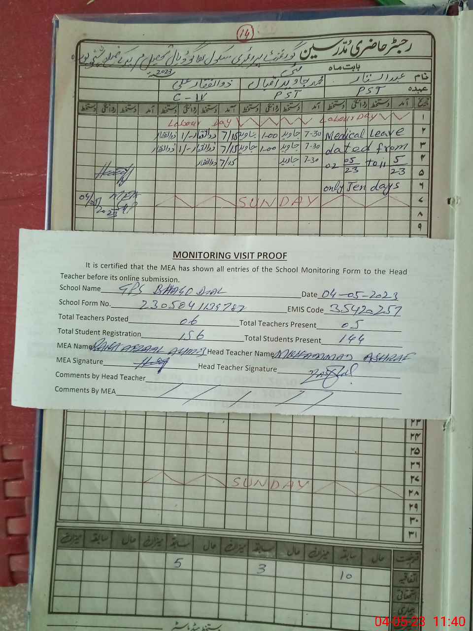 | Attendance Register | Head Teacher | MEA with School | Visit Proof |
