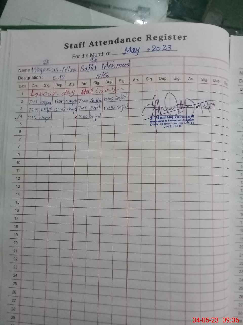 | Monitoring Date: 04-05-2023 | Start Time: 04-05-2023 08:47 AM | End Time: 04-05-2023 09:51 AM | Name of MEA: Sh**** Mu**** Ta**** | |