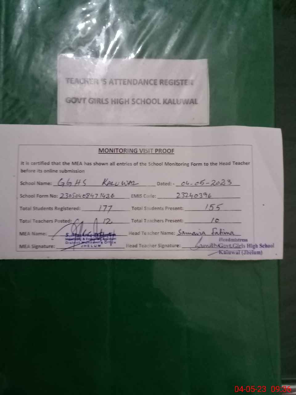 | Attendance Register | Head Teacher | MEA with School | Visit Proof |