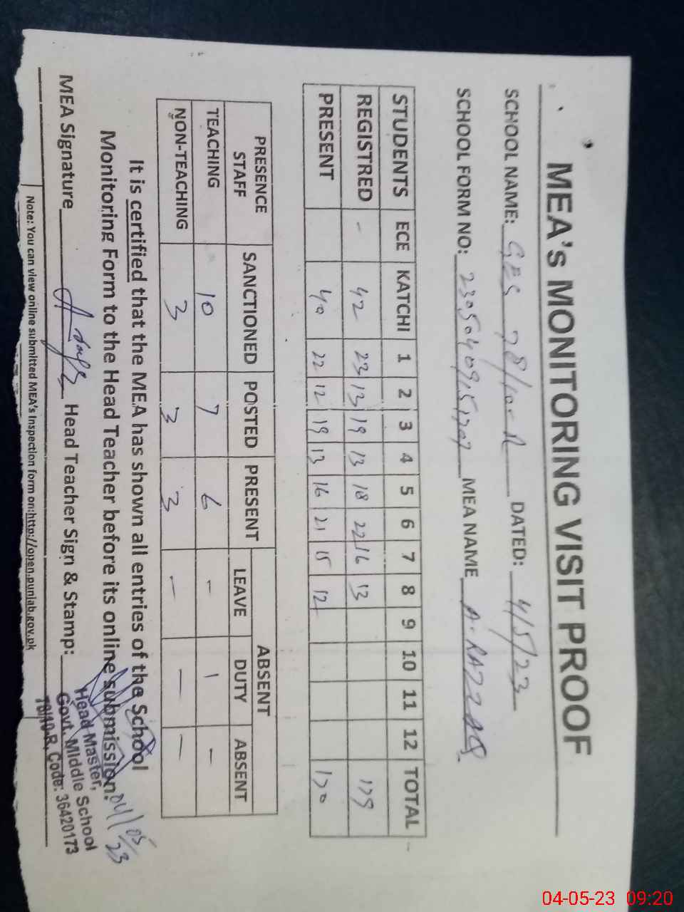 | Attendance Register | Head Teacher | MEA with School | Visit Proof |