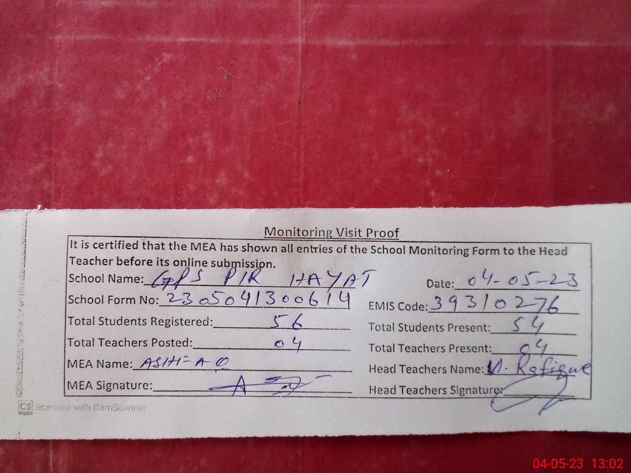 | EMIS Code: 39310276 | Name of School: GPS PIR HAYAT | |||
