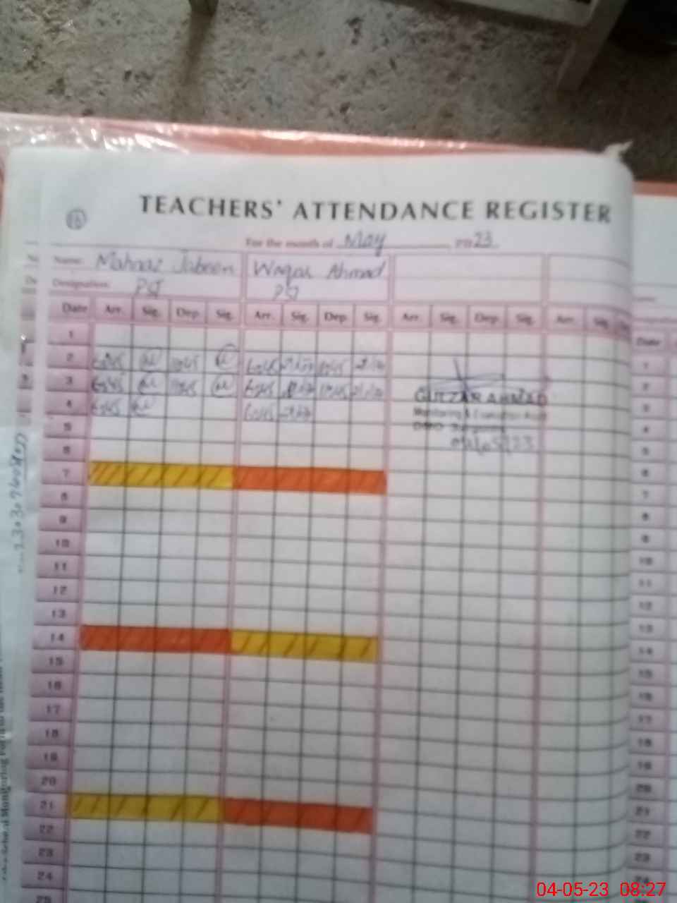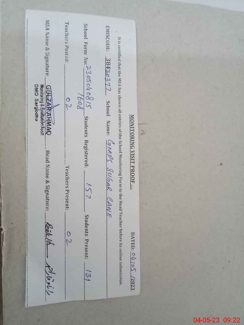 | Attendance Register | Head Teacher | MEA with School | Visit Proof |
