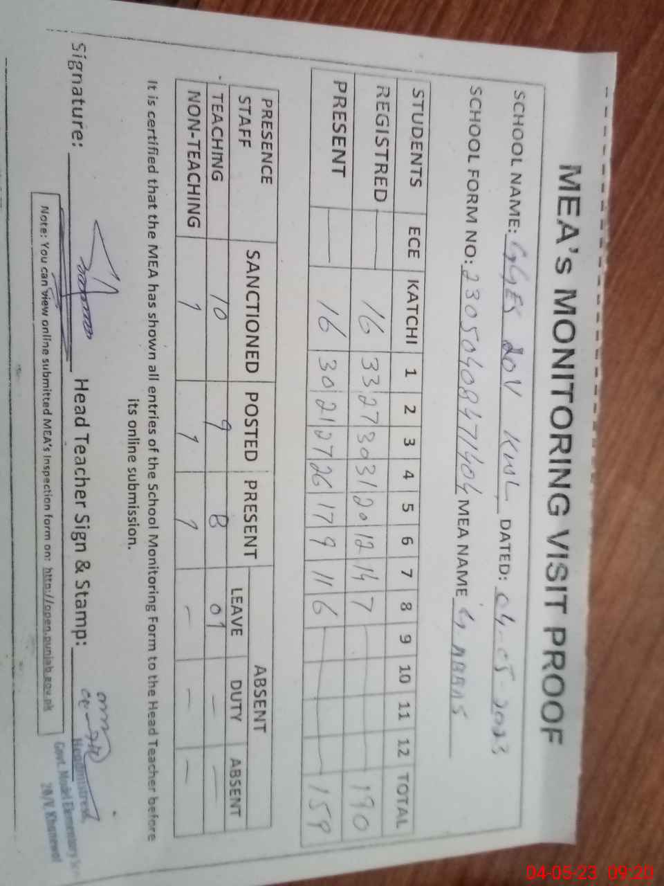 | Attendance Register | Head Teacher | MEA with School | Visit Proof |